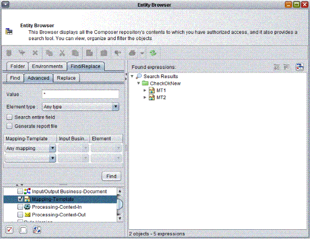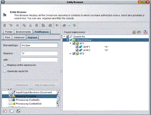 La fonction Remplacer est propre à chaque composant Axway et n'est disponible que si vous sélectionnez un type d'objet unique spécifique à un seul composant. Par exemple, une recherche sur le type d'objet <Business-Document> pourrait renvoyer une liste de <Business-Documents> qui appartiennent à différents composants (AccountingIntegrator, ProcessManager, Integrator). L'onglet Remplacer n'est affiché que si les <Business-Documents> appartiennent tous au même composant Axway.