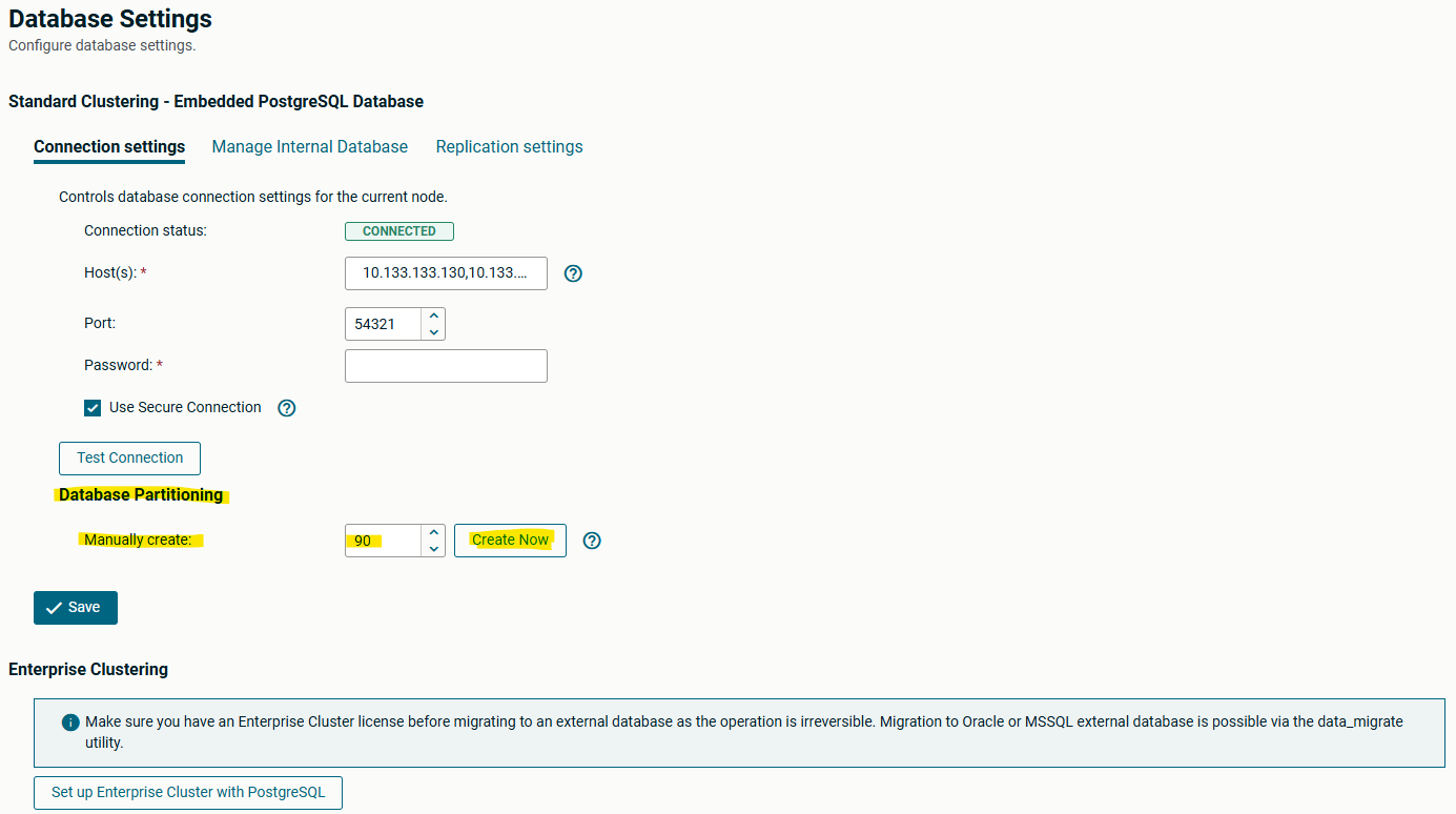 curl -k -u <admin user>:<admin password> -X 'POST' \ 'https://<Server IP or hostname>:<admin port>/api/v2.0/configurations/database/operations?operation=createPartitions&numberOfPartitions=90' \ -H 'accept: */*' \ -H 'Content-Type: multipart/form-data' \ -F 'port='