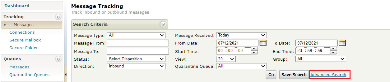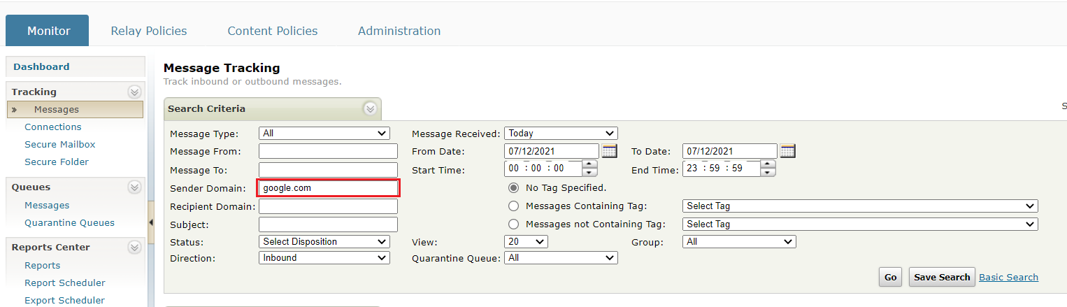 3. Enter the domain that you want to find in the Sender Domain or Recipient Domain search field and press the Go button. You will get all messages for the domain and sub-domains.