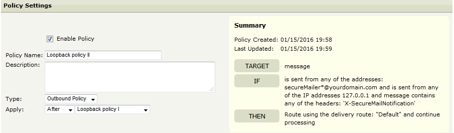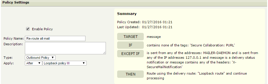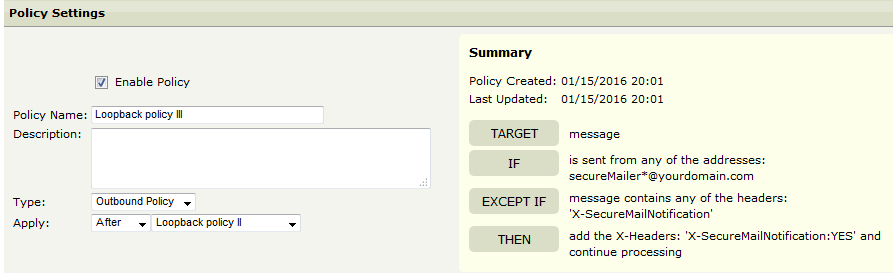Policy 3: This policy adds a header to the secure mail notifications so these can be routed differently by Policy 2.