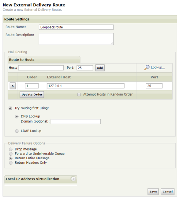 2.2. Create a new external delivery route - make sure to enable Try using DNS first and add 127.0.0.1 as mail routing host.