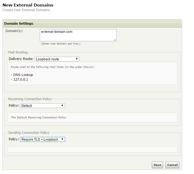 3.1. Go to Relay Policies > External and add all hosts/domains for which this policy applies. Make sure to select the route, created in step II, as the mail route and the policy, created in step I as the default sending policy: