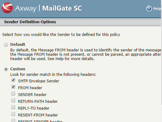IMPORTANT: Under “Sent From: Message is sent from” condition, make sure to click the “sent from” active link and switch the header to custom, and then select both SMTP Envelope sender AND FROM header. If you do not do this, the secure message notifications for the looped messages will go into an endless loop if they cannot be delivered.