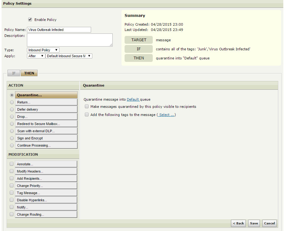 3. Under "THEN" select Quarantine and make sure that "Make messages quarantined by this policy visible to recipients" is NOT checked.