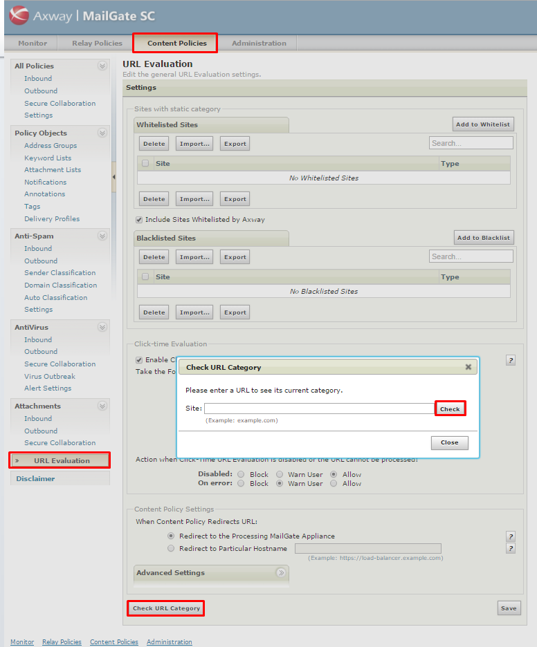 1. MailGate's Admin UI > Content Policies > URL Evaluation > using the Check URL Category button: