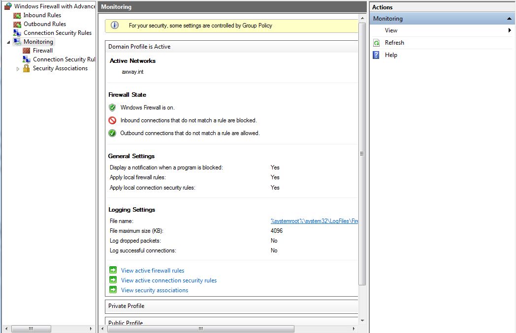 -If the port is not used by another third-party application, check if the port is opened on firewall level. This can be checked by navigating to Start Menu->Control Panel->Windows Firewall->Advanced Settings->Monitoring->View Active Firewall rules.