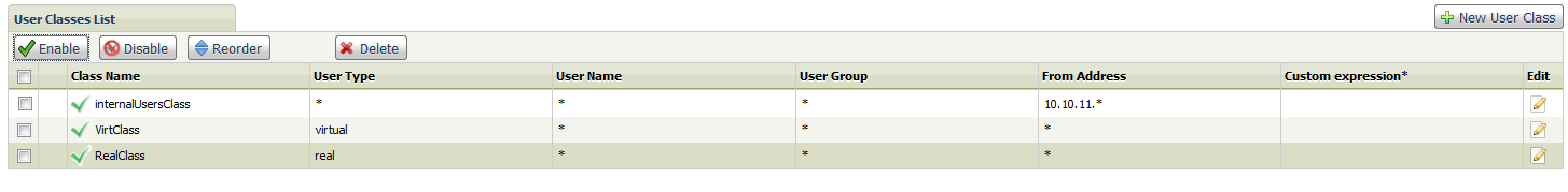 When the Class is created, enable it and move it to the top of the list. This is important, since ST will assign the top-most Class that a user matches into, so if a user matches both the "InternalUsersClass" and the "VirtualUsers" classes, ST will select the one that sits higher on the list.