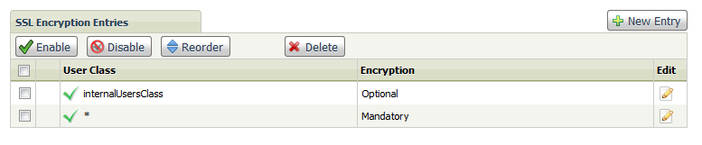 2. Go to Admin UI > Access > Secure Socket Layer page. Under the section SSL Encryption Entries change the value for the User Class “*” to Mandatory.
