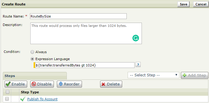 Another possible usage of this functionality is if you want to route only files that are larger than a specific size. The below example demonstrates this case exactly - it will process only files that are larger than 1KB.