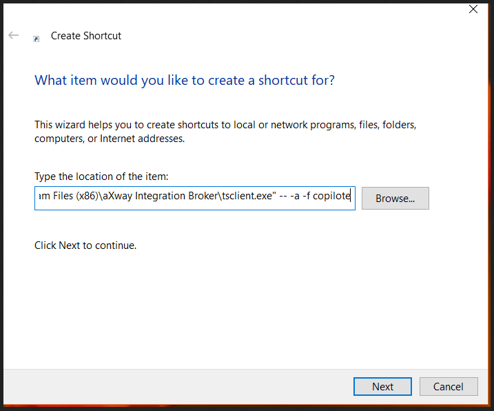 2) create a new shorcut -> select the location of the executable tsclient.exe (exempla C: \ Program Files (x86) \ aXway Integration Broker> tsclient.exe) and add - -a -f copilote (as in the screenshot file - copilot.png)
