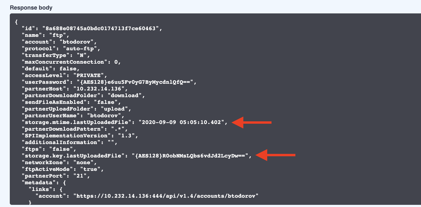 curl -X POST "https://10.232.15.170:444/api/v1.4/sites/ftp" -H "accept: application/json" -H "Content-Type: application/json" -d "{ \"storage.key.lastUploadedFile\": \"{AES128}e6uu5Fv0yG7ByMycdnlQfQ==\", \"storage.mtime.lastUploadedFile\": \"2020-09-10 07:05:10.402\"}