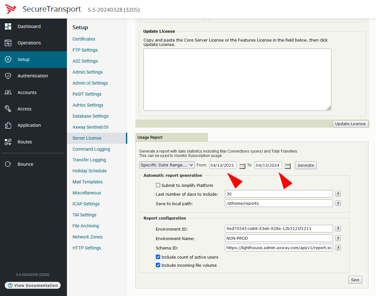 2. In the Usage Report section, select the last option of the drop-down menu - "Specific Date Rage...". Once selected you will see calendar, where you can choose the period (e.g. From: 04/01/2023 To: 04/01/2024).